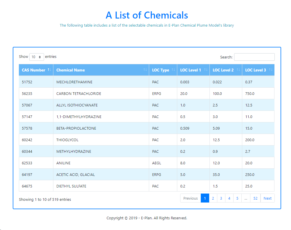 The following table includes a partial list of the selectable chemicals in E-Plan Chemical Plume Model's library and click here to see complete list: