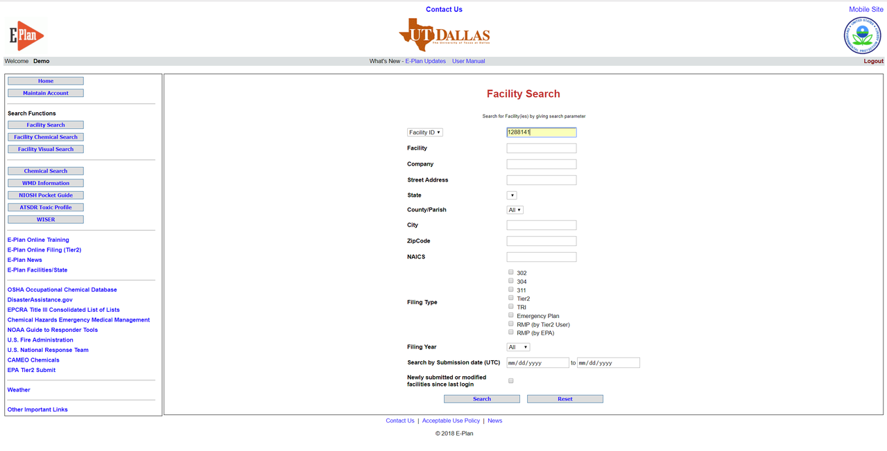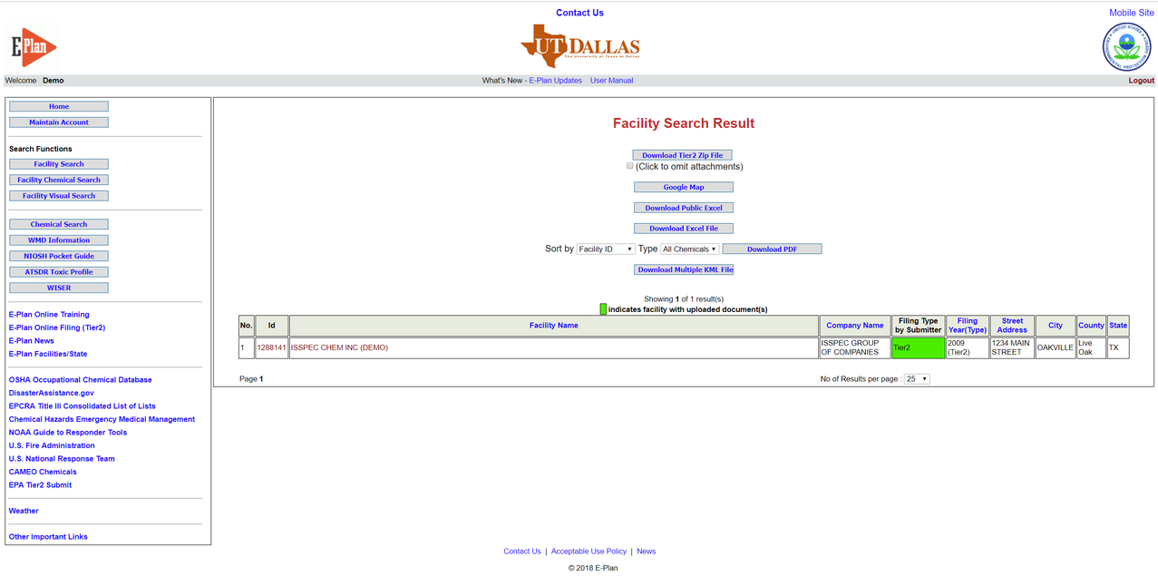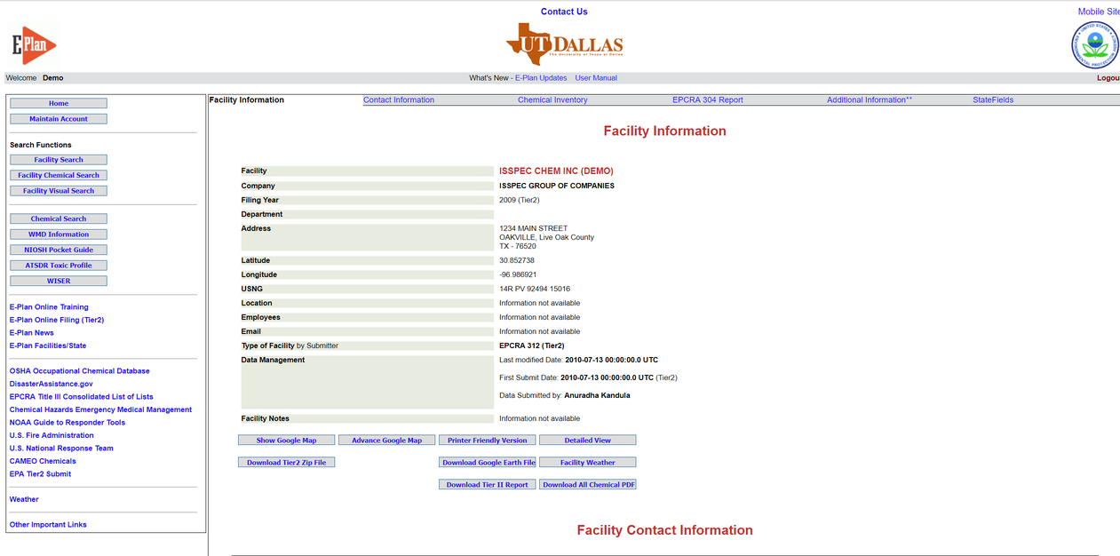 - Click on the “ISSPEC CHEM INC (DEMO)” link to select that facility. The Facility Information page will appear