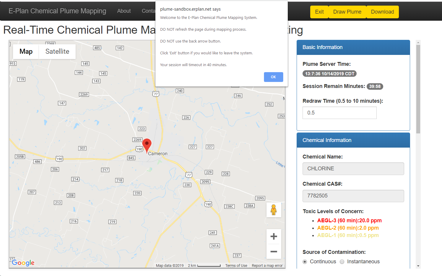 Welcome to E-Plan chemical plume mapping system. DO NOT refresh the page during mapping process. DO NOT use the back arrow button. Click “Exit” button if you would like to leave the system. Your session will be timed out in 40 minutes. |